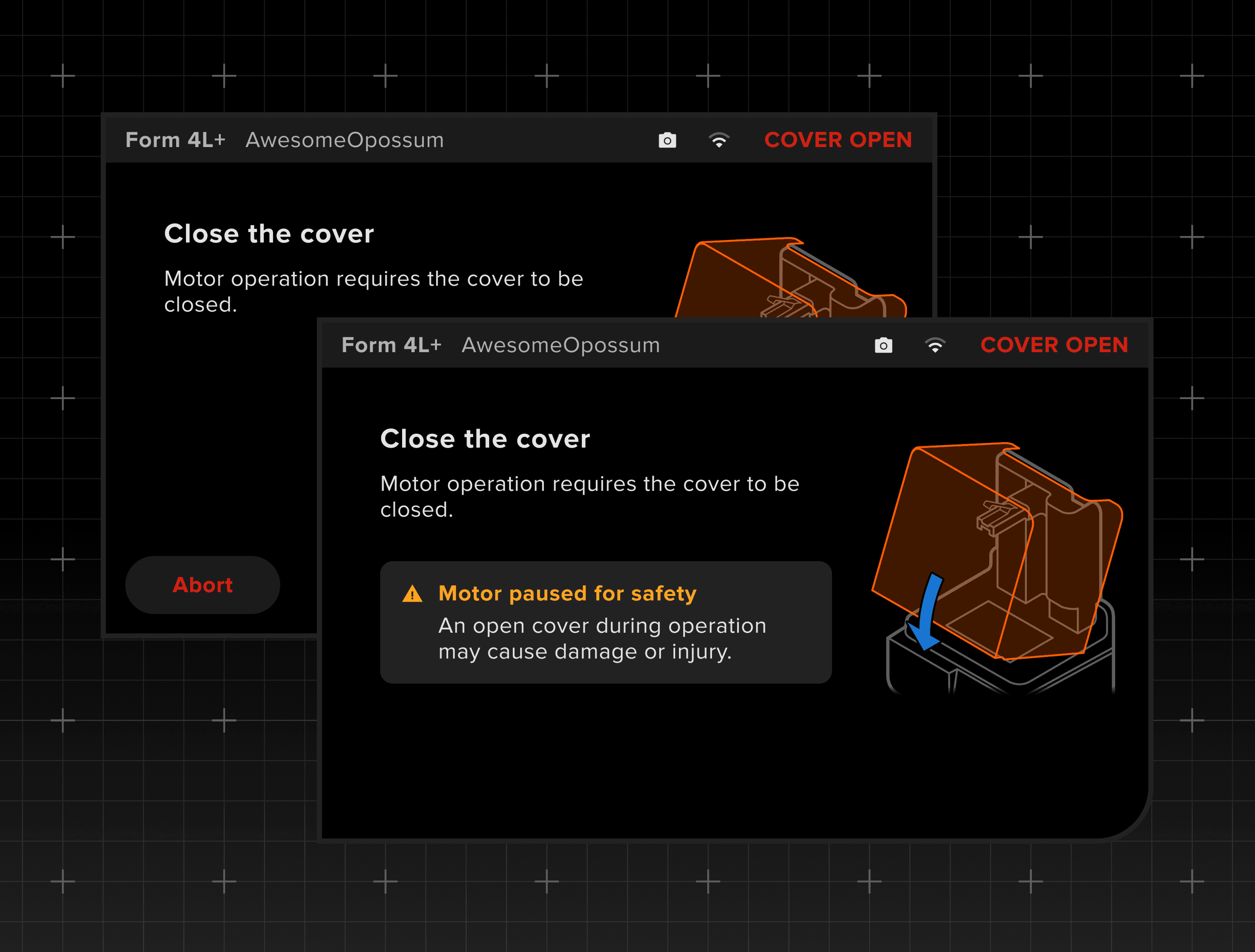 Interrupting the motor operation can cause injury and machine damage. To enhance safety, I designed contextual warning messages to keep user informed at different stages of the task about what happens next and what they should do.