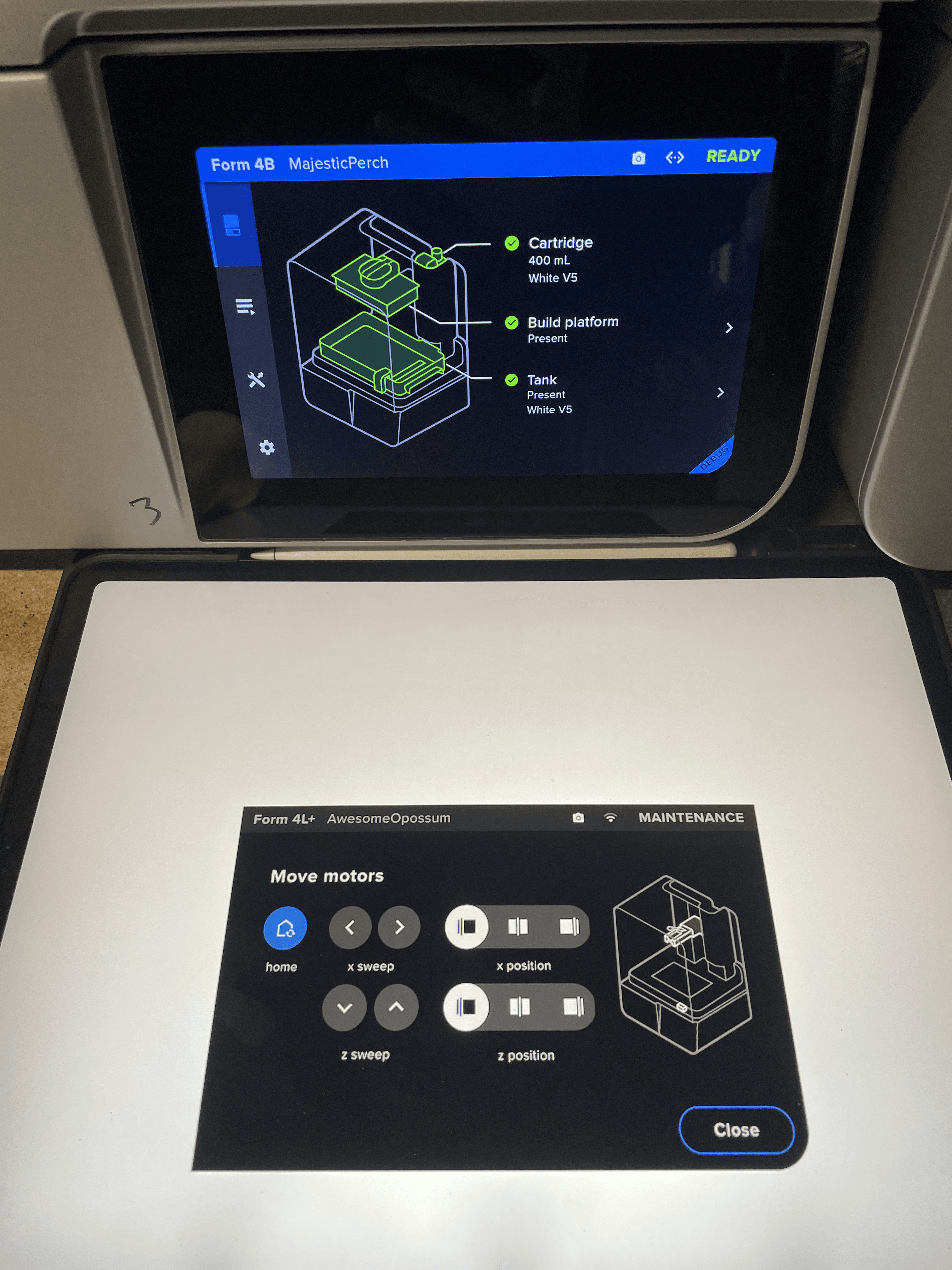 Jogging is not as common as the other two, but works the best when user needs to reach a specific spot on build platform or resin tank, such as checking rail misalignment.