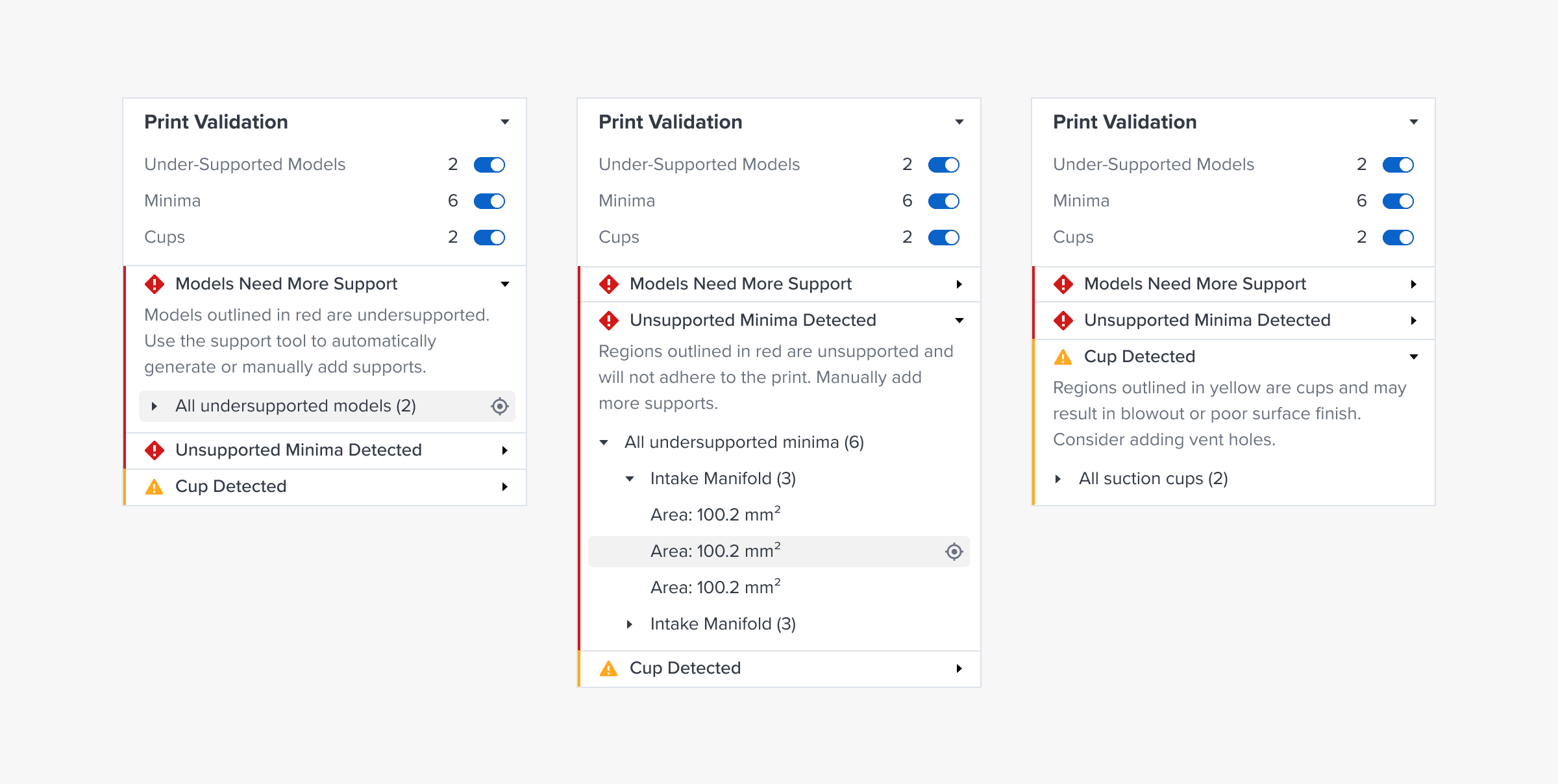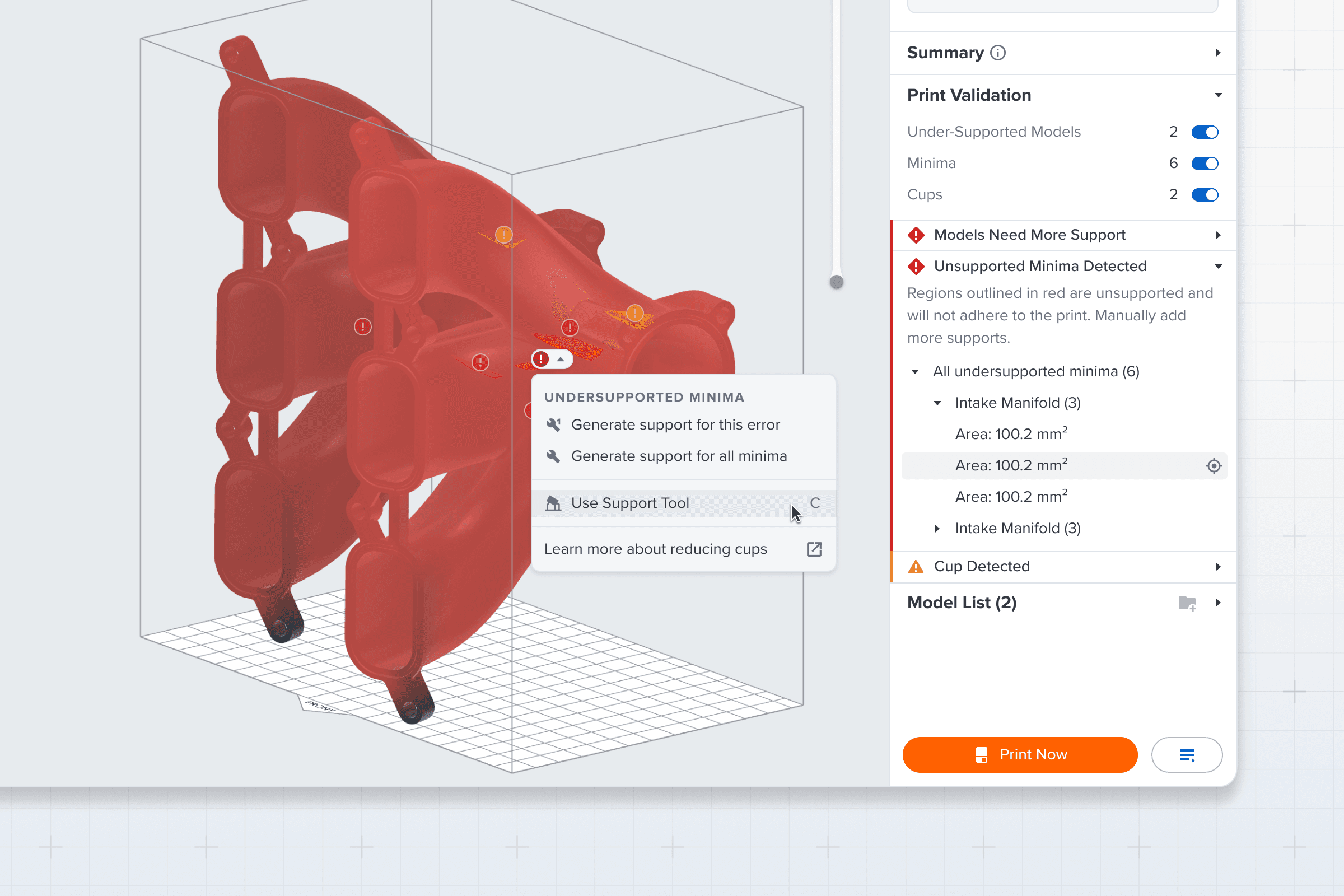 3D printing can go wrong very easily. The failed print can be caused by both hardware and software issues. In PreForm, Print Validation is the only software-end troubleshooting functionality that detects potential error in real-time as user edits the digital model.