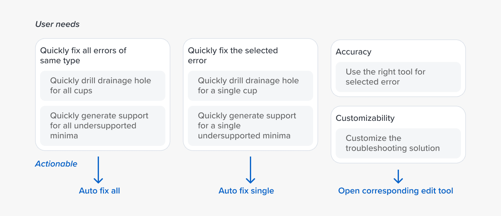 From research I learned that users want to decide which error to fix with control and confidence. So in addition to use pin on model as a helper for focusing, users should be able to select the error they want to fix based on type, parent model, and prioritization.