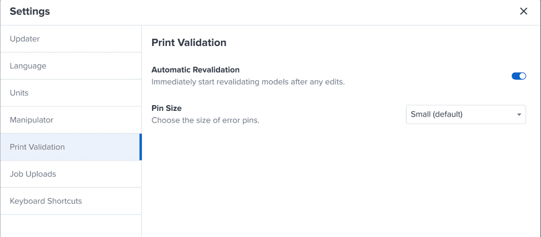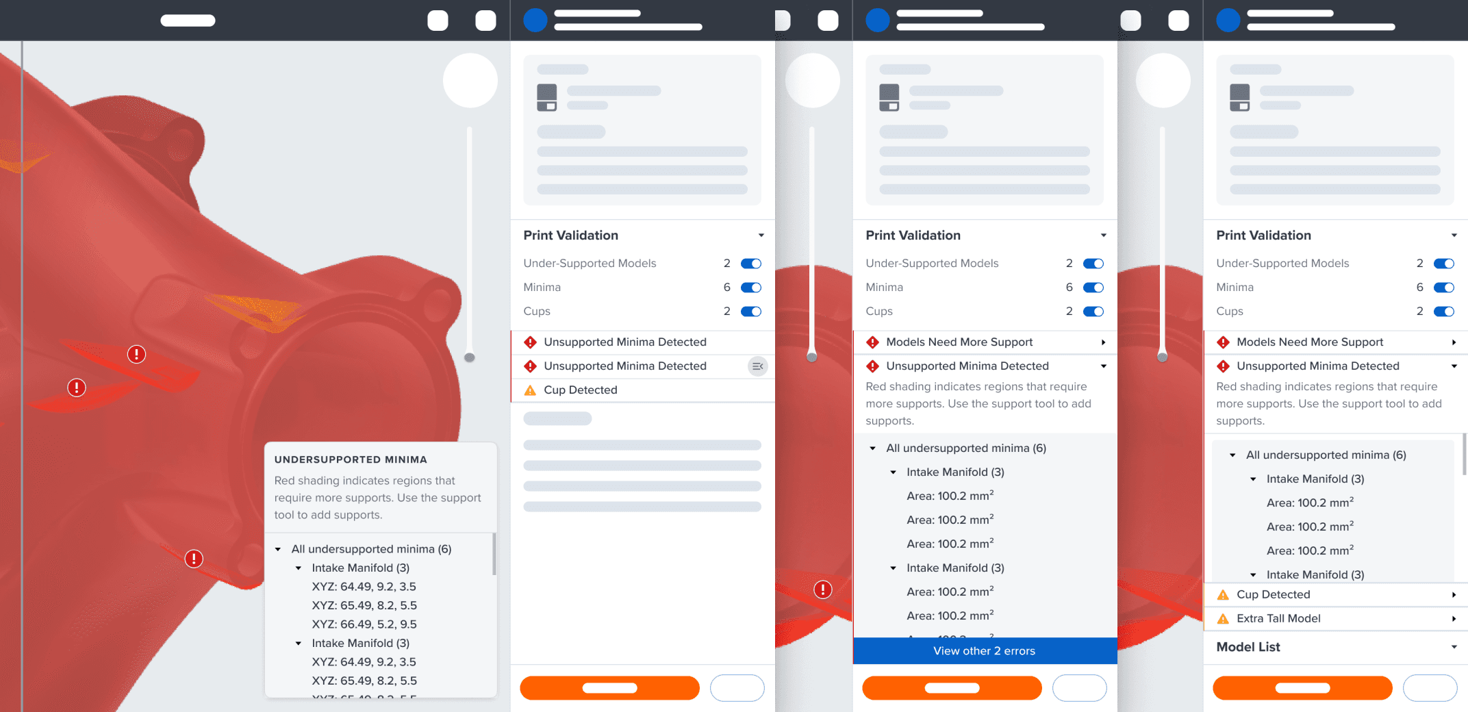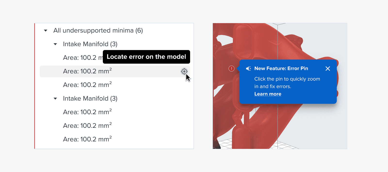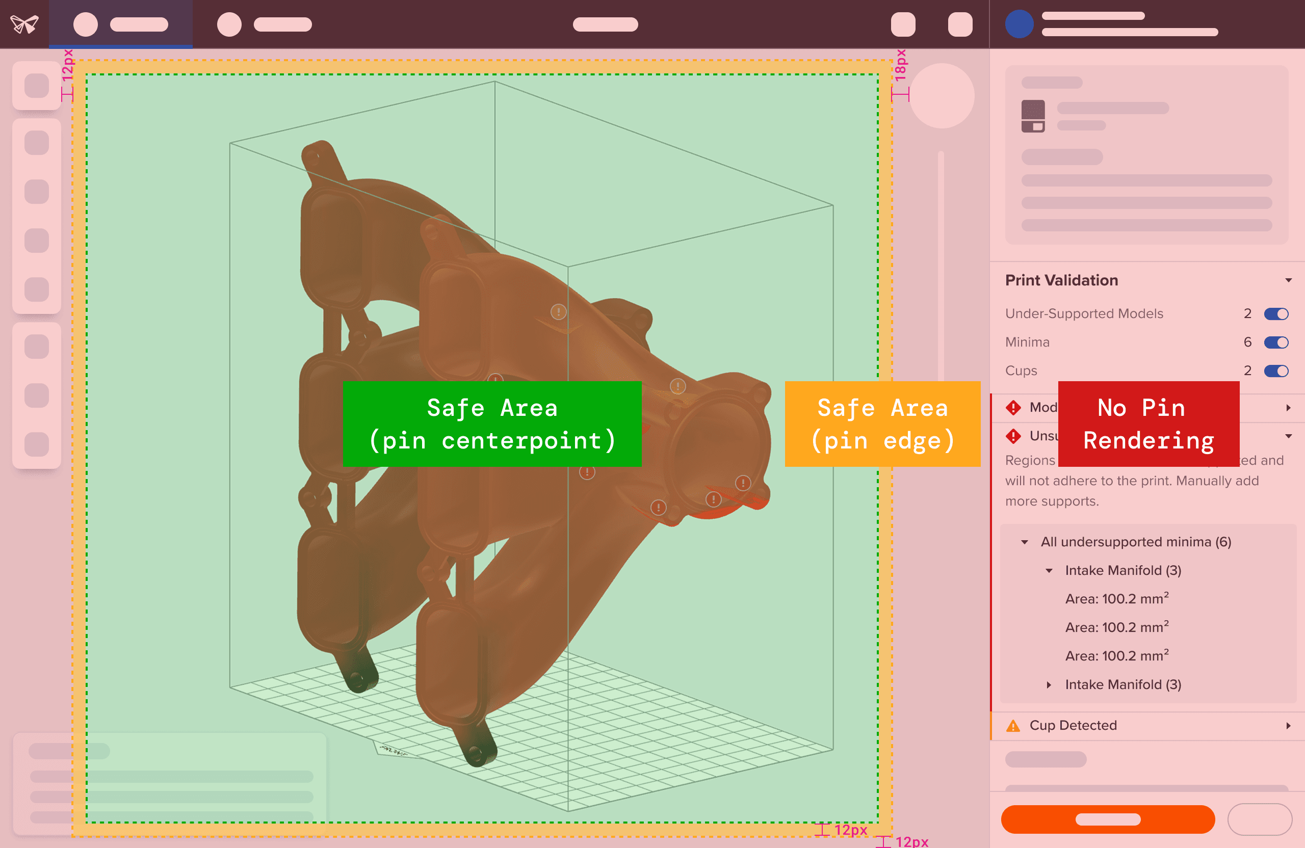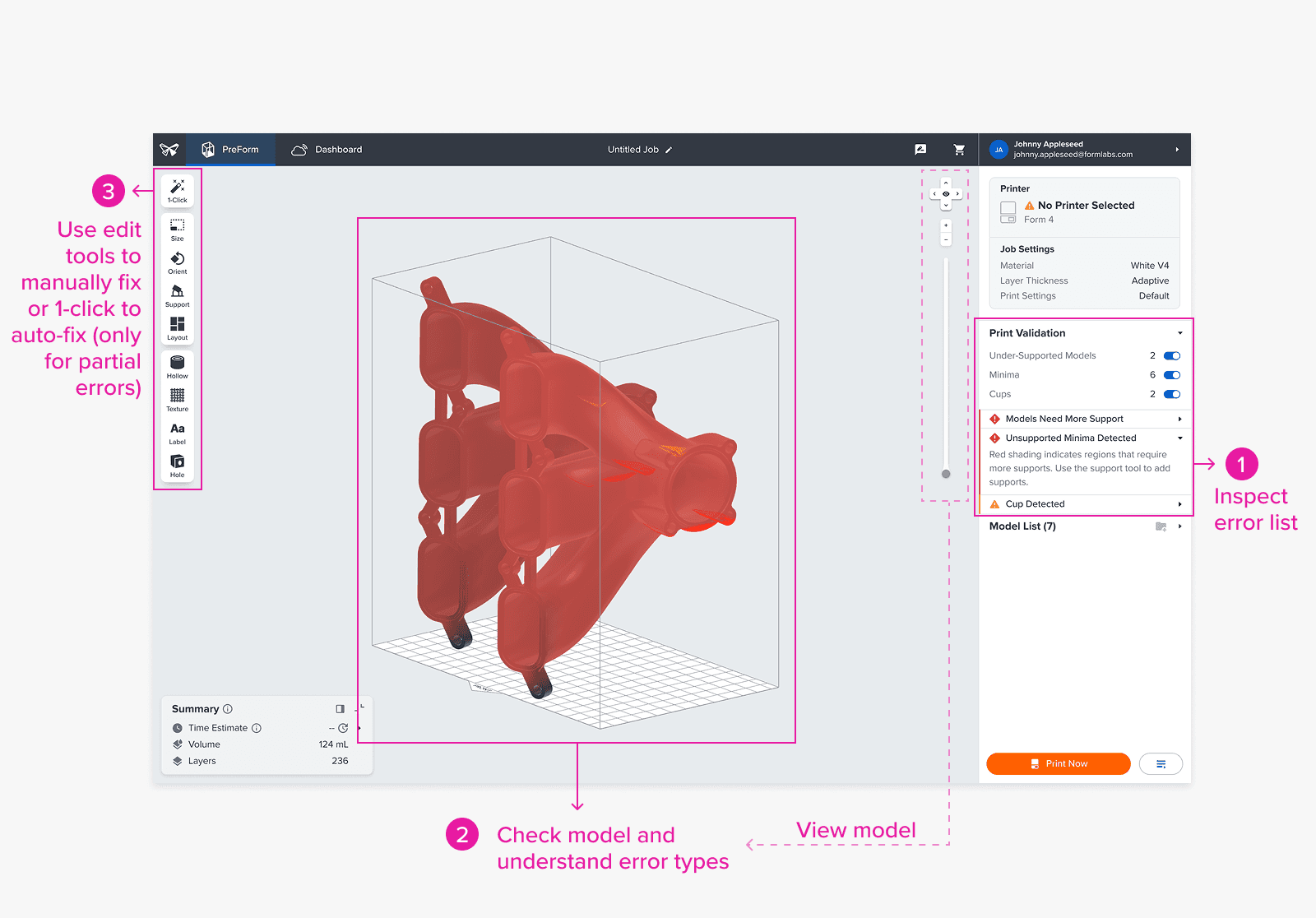 Print Validation in PreForm intends to surface error areas on model and provide instruction via text.