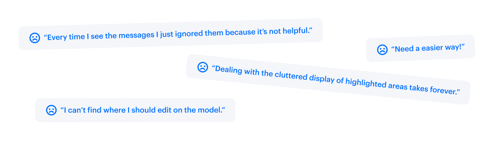 Non-engineering users depend heavily on error highlights yet find it difficult to pinpoint errors on multiple models because of the clutter visuals. Errors are easily getting missed.